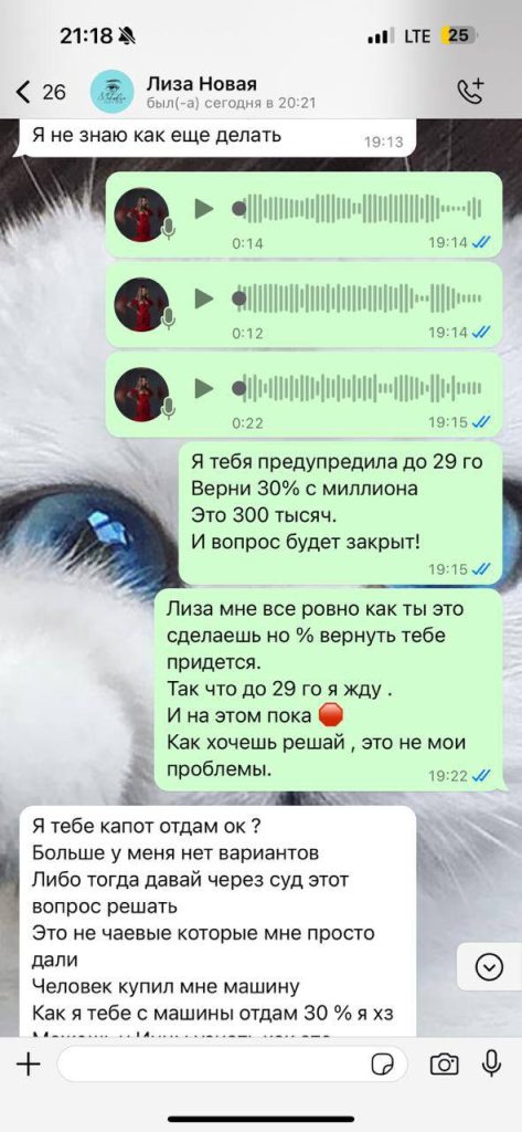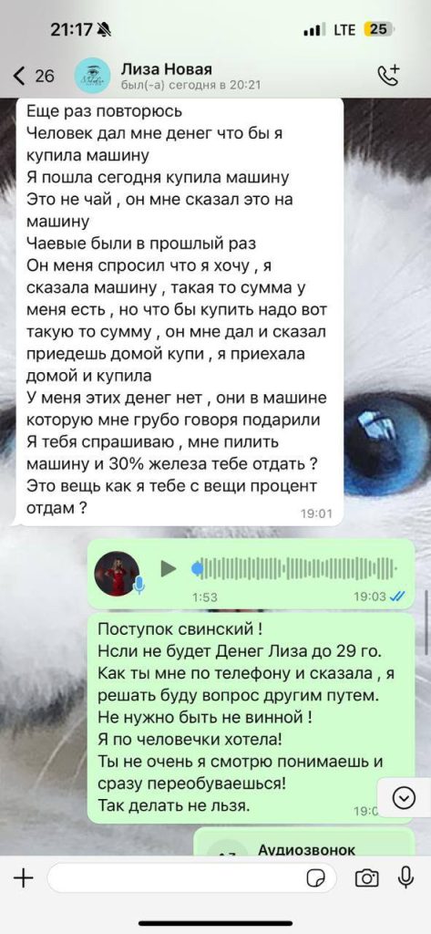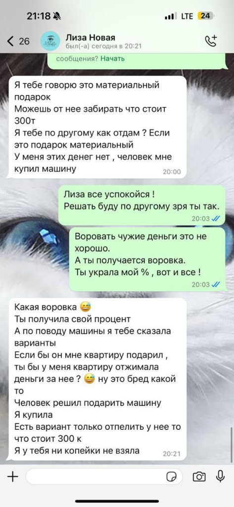 Заказчик, имея с агентством дружеские отношения, поделился этим случаем. Когда агентство связалось с Лизой, она сначала сделала вид, что не знает о чаевых, а затем заявила, что это были не чаевые, а деньги на машину. На запрос о переводе 30% с этих средств Лиза ответила, что уже потратила их и собирается взять кредит.