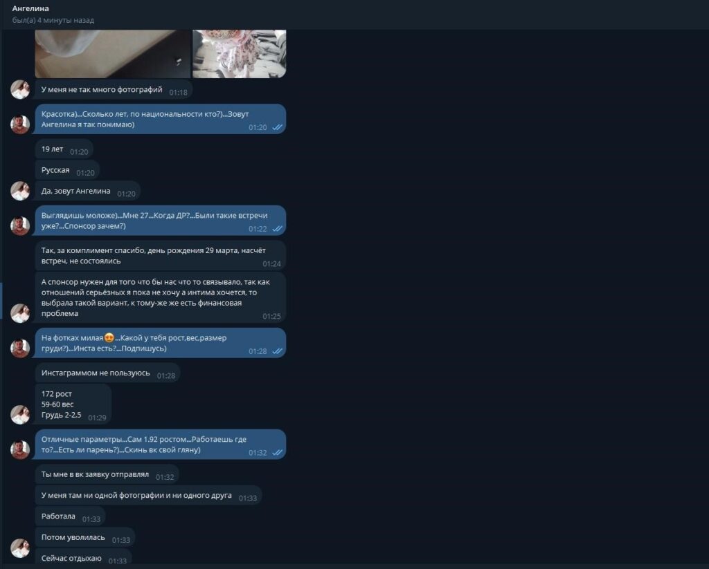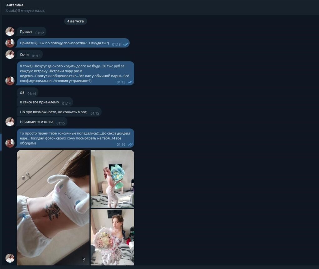 Шлюха Ангелина, из Сочи сидела на сайте “Атолин”, где охотно продавала себя за деньги. Не стесняясь, она отправляла свои откровенные фото и видео потенциальным клиентам, стремясь выжать как можно больше денег за свои услуги.
